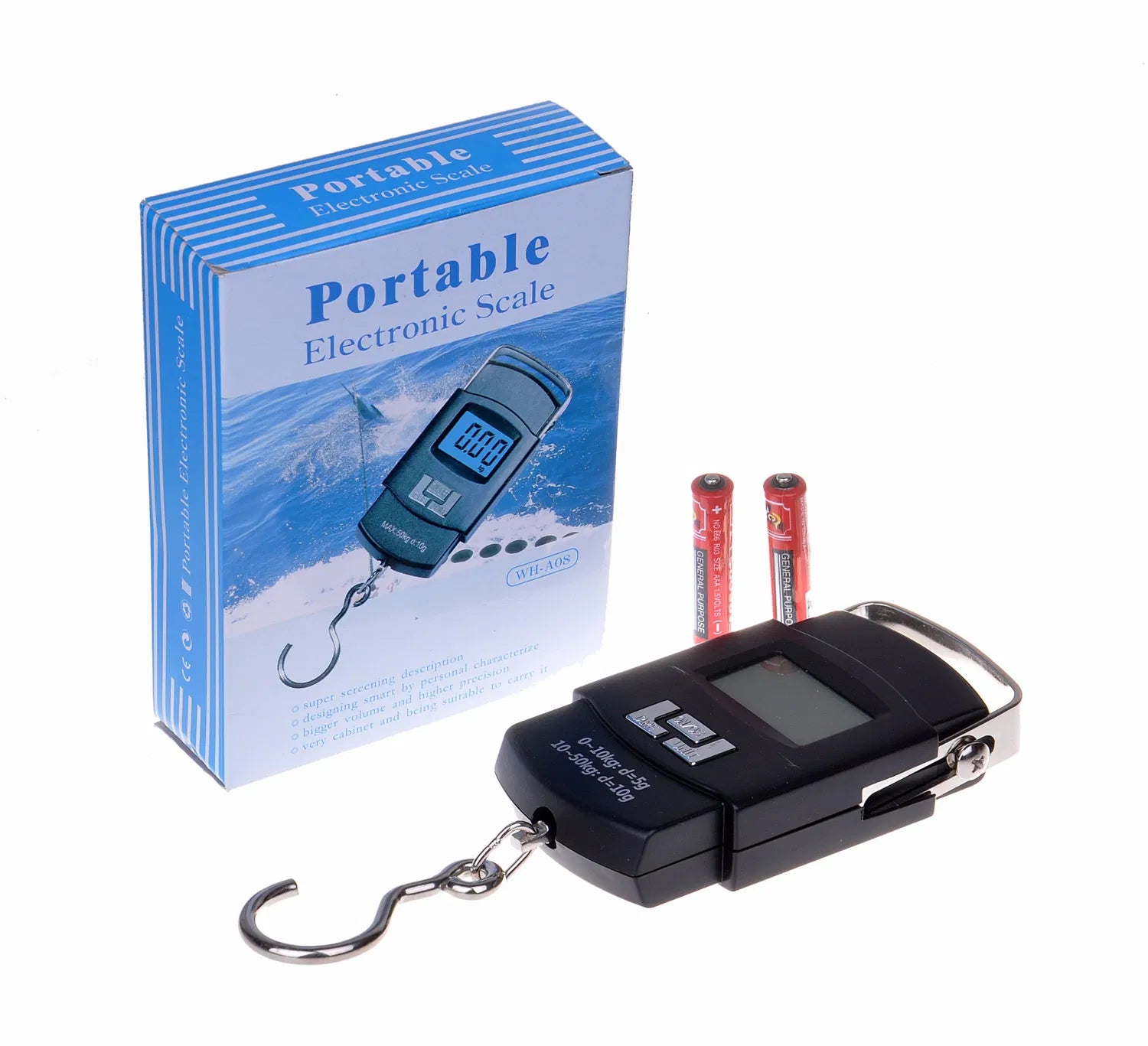 Handheld tubular digital spring balance for marine use, 50 kg capacity. Robust ABS/polycarbonate body with stainless steel top ring and bottom hook for corrosion resistance on board. Large backlit LCD with unit selection (kg/lb/N), zero/tare, hold/peak functions, overload indication, and auto power-off. Resolution 10 g, accuracy ±0.2% of full scale. Powered by 2×AAA batteries with low-battery alert. Operating temperature −10 °C to +40 °C; splash-resistant design for deckside use. Compact tube form for easy stowage; supplied with protective sleeve and quick-start instructions printed on the body.